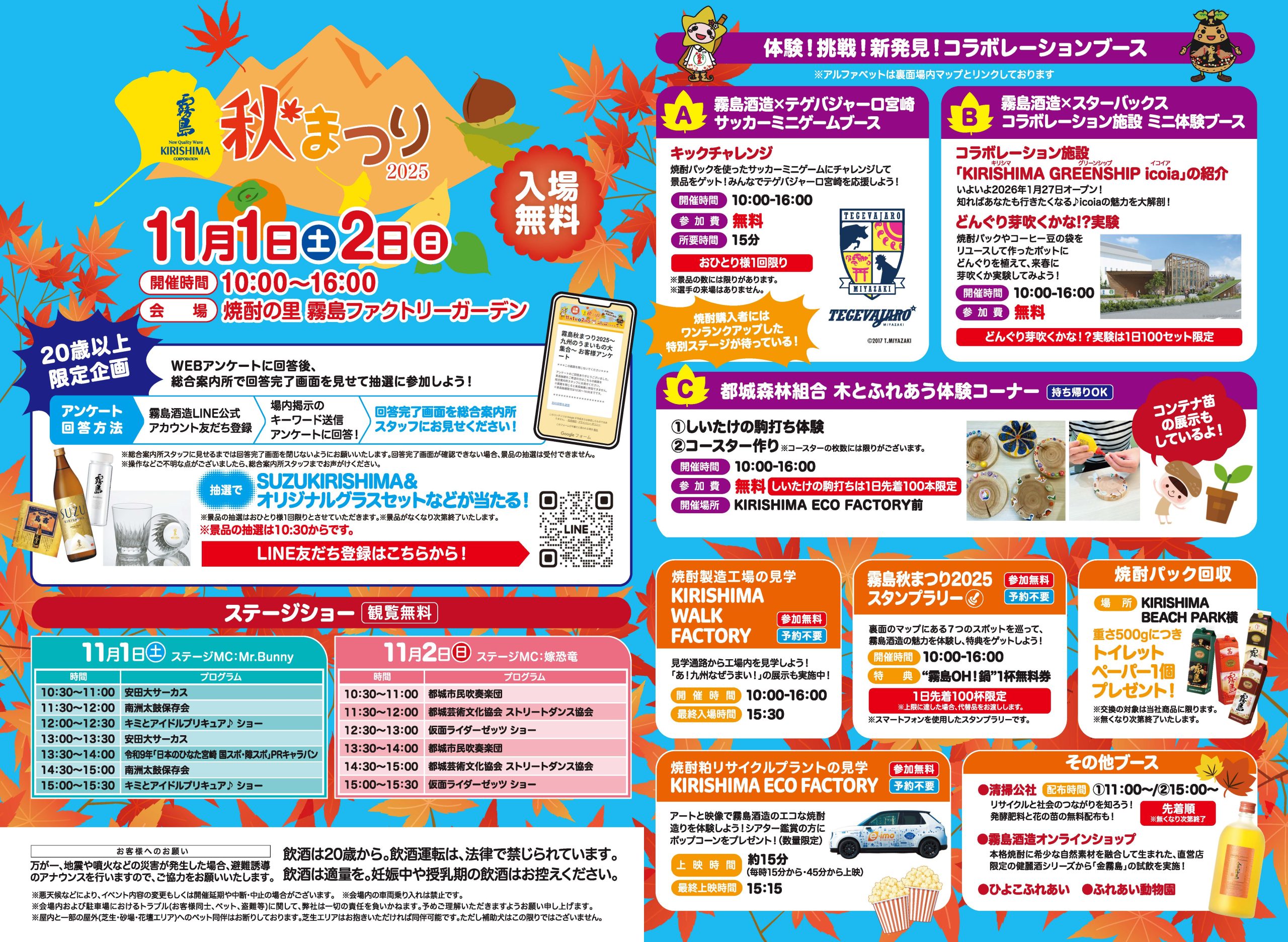 ◆スターバックス コーヒー ジャパン 株式会社 〇霧島酒造×スターバックス コラボレーション施設ミニ体験ブース 2026年にオープンするコラボレーション施設に関する展示を行います! 〇どんぐり芽吹くかな!?実験 焼酎パックやコーヒー豆の袋をリユースしたポットにどんぐりを植えて、来年の春に芽吹くか実験してみよう! 開催時間:10:00~16:00 参加費:無料 ※予約不要 ※どんぐり芽吹くかな!?実験は各日100セット限定です。無くなり次第終了いたします。 ◆株式会社テゲバジャーロ宮崎 〇霧島酒造×テゲバジャーロ宮崎 サッカーミニゲームブース 焼酎パックを使ったサッカーミニゲームにチャレンジして景品をゲット!みんなでテゲバジャーロ宮崎を応援しよう! 開催時間:10:00~16:00 参加費:無料 ※予約不要 ※所要時間15分 ※景品の数には限りがあります。 ※おひとり様1回限りです。 ※選手の来場はありません。 ◆都城森林組合 〇しいたけの駒打ち体験 にょきにょきワクワク!しいたけ駒打ち体験! 〇コースター作り 世界に一つだけのオリジナルコースターを作ってみよう! 開催時間:10:00~16:00 参加費:無料 開催場所:KIRISHIMA ECO FACTORY前 ※予約不要 ※しいたけの駒数は各日100本限定です。 ※駒打ちをしたしいたけの原木は持ち帰ることができますので袋をご持参ください。 ※コースターの枚数には限りがあります。 |