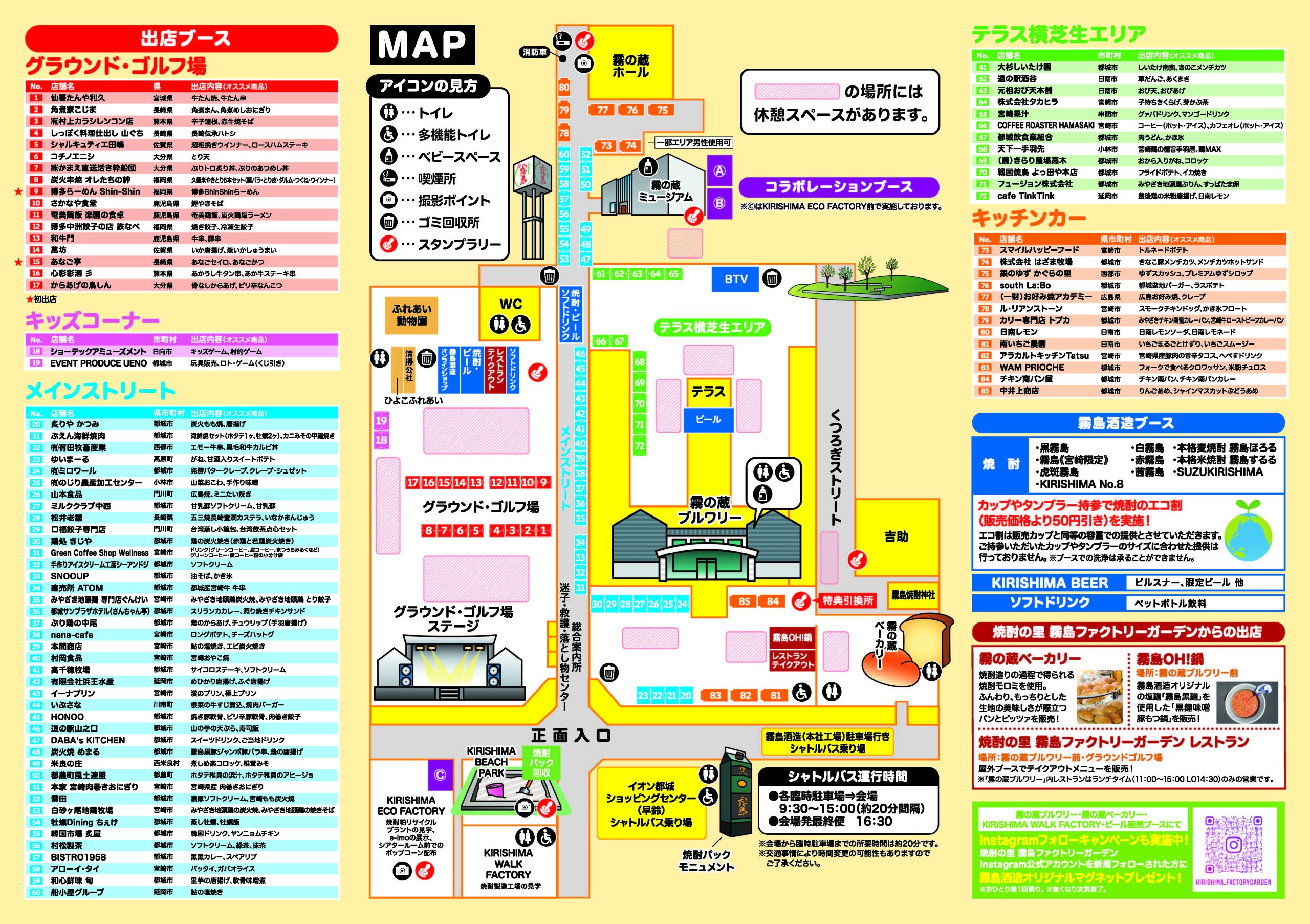 | アクセス方法 | ◆臨時駐車場 ①会場隣接駐車場 ②霧島酒造 本社工場駐車場 ③イオン都城ショッピングセンター(早鈴)屋上駐車場 ※臨時駐車場は8:45から開放いたしますが、開場は9:00となります。 ※①は台数が限られるため継続的な満車、および周辺の混雑が予想されます。 満車の場合、入口を封鎖します。道路上で空車待ちをすることはできません。 ※イオンモール都城駅前店の駐車場は、臨時駐車場ではございません。 ※駐車場に関する情報は変更となる場合がございます。 ◆シャトルバス 臨時駐車場②③⇒会場 【始発9:30 最終15:00】 会場⇒臨時駐車場②③ 【最終16:30】 ◆公共交通機関 【都城駅からお越しの場合】 ①タクシーのご利用(所要時間:約10分) ②公共交通機関(宮交バス)のご利用(所要時間:約30分) 都城駅前1番乗り場で「41・42・43」に乗車→「志比田」で下車後、「焼酎の里 霧島ファクトリーガーデン」まで徒歩12分 【西都城駅からお越しの場合】 ①タクシーのご利用(所要時間:約10分) ②公共交通機関(宮交バス)のご利用(所要時間:約20分) 西都城駅2番乗り場で「41・42・43」に乗車→「志比田」で下車後、「焼酎の里 霧島ファクトリーガーデン」まで徒歩12分 |