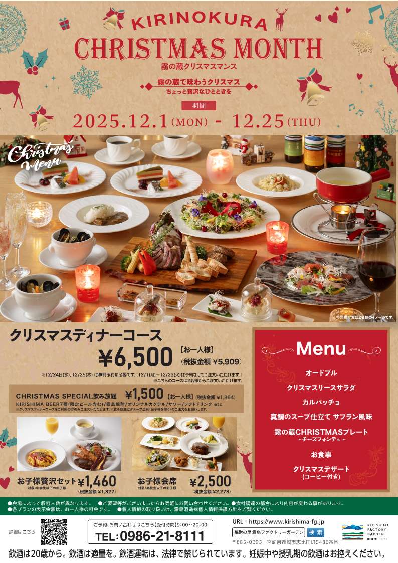 「焼酎の里 霧島ファクトリーガーデン レストラン」では、2025年12月1日(月)から25日(木)までにかけて「KIRINOKURA CHRISTMAS MONTH」を開催いたします。